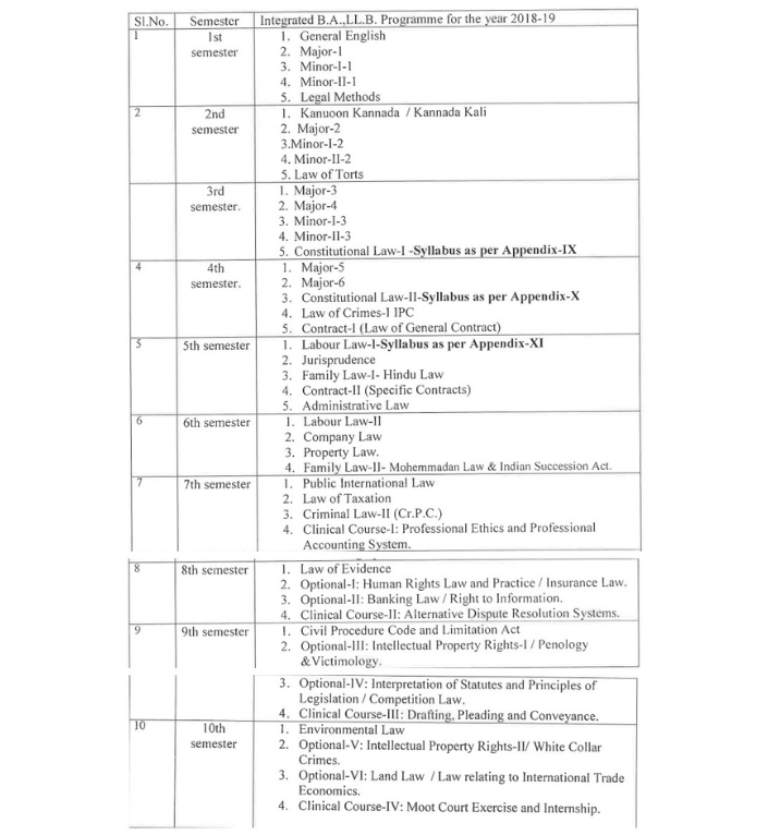 The B.A, LL.B (5 Years Integrated Degree Course) offered by Karnataka State Law University spans five academic years, integrating both Bachelor of Arts (B.A) and Bachelor of Laws (LL.B) components. The course is structured into 10 semesters, each lasting for 18 weeks, providing students with a comprehensive understanding of various legal aspects.